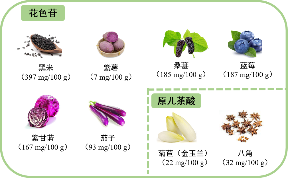 富含花色苷的食物主要是紫色、红色、黑色的植物性食物,包括谷薯类的黑米、红米、紫番薯、紫玉米等,蔬菜类的紫茄子、紫甘蓝、红菜苔、心里美萝卜等,水果类的桑葚、蓝莓、越橘、菠萝、葡萄、黑莓、草莓、苹果等。富含原儿茶酸的食物主要有八角、花椒等香料、谷物的全麦、菊苣(金玉兰)、生菜、李子、蓝莓等蔬果、红酒、咖啡、茶水等饮品。
