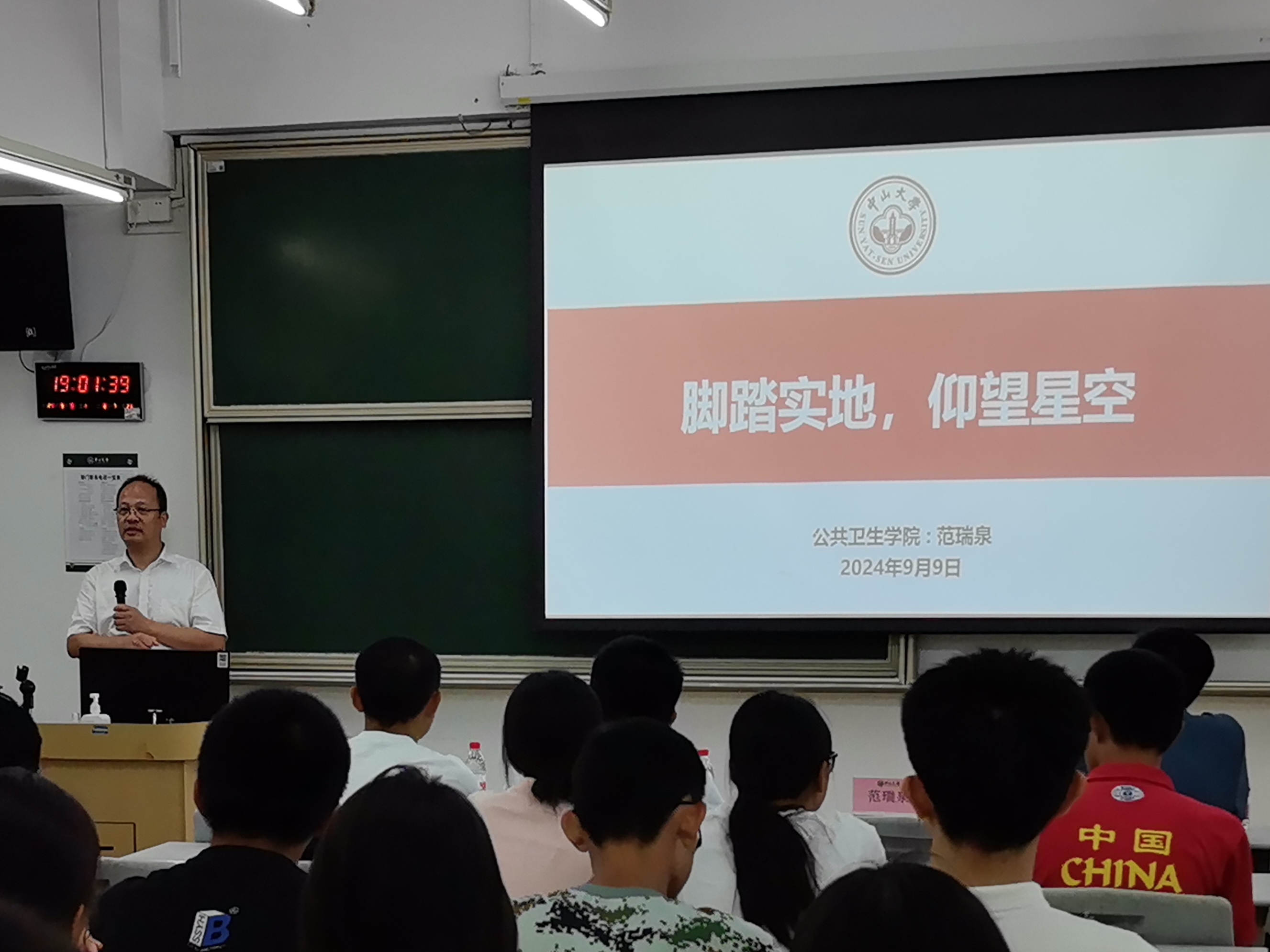 9月9日晚,公共卫生学院首场入学教育讲座在逸夫楼逸303室拉开帷幕。范瑞泉书记以《脚踏实地,仰望星空》为题,深情讲述了北校园红楼背后的故事。围绕“医病医身医心,救人救国救世”的崇高理念,生动诠释了医学生的神圣职责与使命,将医学生比作“人间天使”,激发了同学们对医学事业的无限敬仰与向往。范书记还巧妙地将“公卫与临床”的异同比作“小处方与大处方”,让同学们对作为一名公共卫生专业学生的使命有了更深刻的理解。他激励同学们要志存高远,脚踏实地,努力学习,成长为一名懂临床医学、精预防医学、会社会治理的复合型人才。随后,王庆副院长详细地介绍了公共卫生学院的本科学业规划,助力新生们打破高中思维的束缚,领略预防医学的独特魅力,迅速融入丰富多彩的大学生活,不断提升自我综合素质与专业水平。