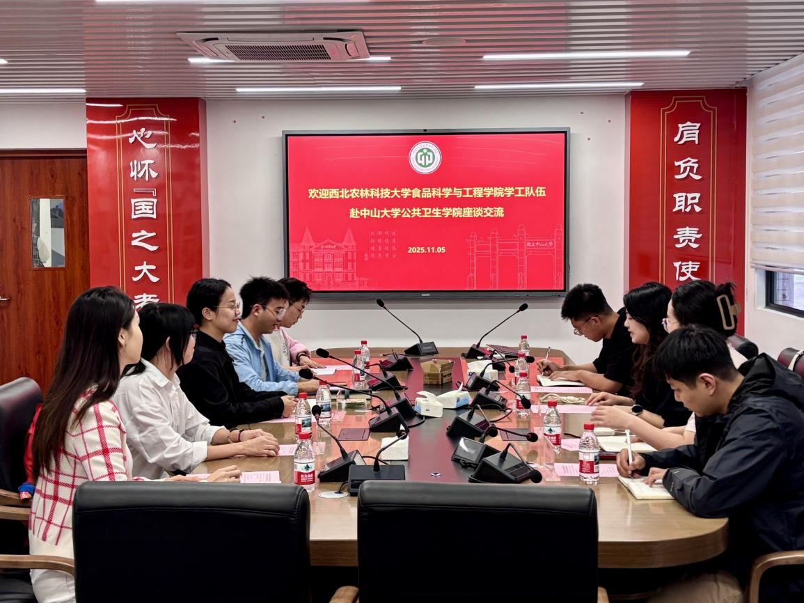 2025年11月5日15:00,中山大学公共卫生学院与西北农林科技大学食品科学与工程学院研究生会交流会在中山大学北校园公共卫生学院楼党员活动室顺利举行。本次交流会由中山大学公共卫生学院团委副书记李永强主持,西北农林科技大学食品科学与工程学院李涓睿老师、研究生会主席团成员乔锋(兼执行主席)、甄玉荷、姬润华,以及中山大学公共卫生学院团委书记彭雪婷老师、研究生会主席团成员李礼杰(兼执行主席)、毛维娅、聂祎凡及各部门召集人共同参会,围绕研究生会组织建设、特色活动创新与学生服务优化等核心议题开展了深入分享与热烈讨论,为校际研究生会工作交流搭建起高效沟通的平台。