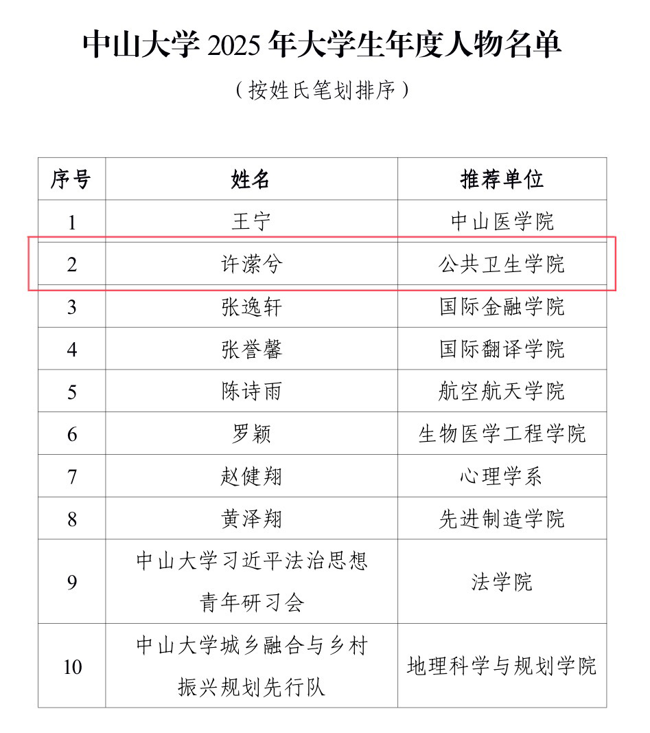 近日,中山大学2025年大学生年度人物评选结果正式揭晓。经评选,8名同学、2个团队斩获“中山大学2025年大学生年度人物”奖项。我院2023级博士研究生许潆兮成功获评“中山大学2025年大学生年度人物”。