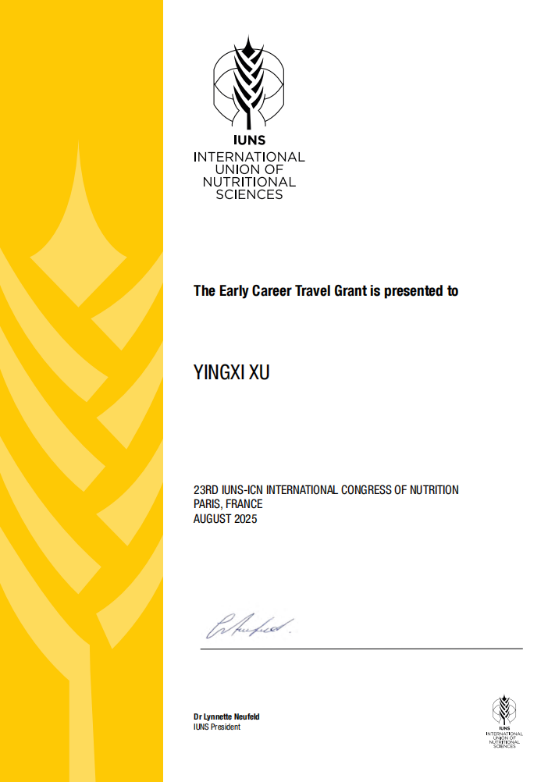 行远自迩,笃行不怠。许潆兮申报了2024年国家自然科学基金青年学生基础研究项目,通过层层选拔,成功获得项目资助,研究有望揭示心血管代谢疾病早期进展新机制,为个体化早期营养防治提供新措施。她同时入选了2024年度中国科协青年人才托举工程博士生专项计划,并主持中山大学博士研究生科研创新项目1项。