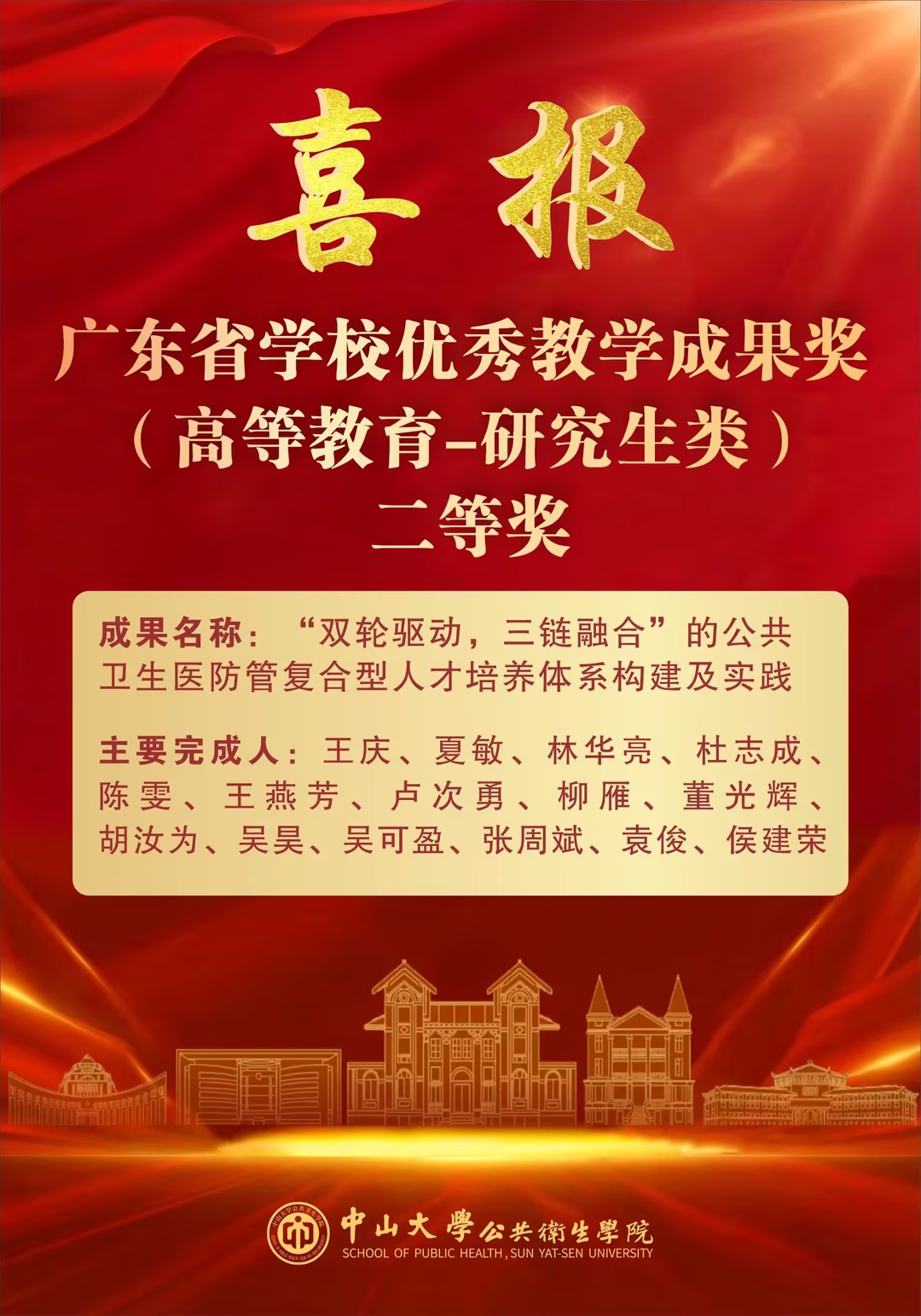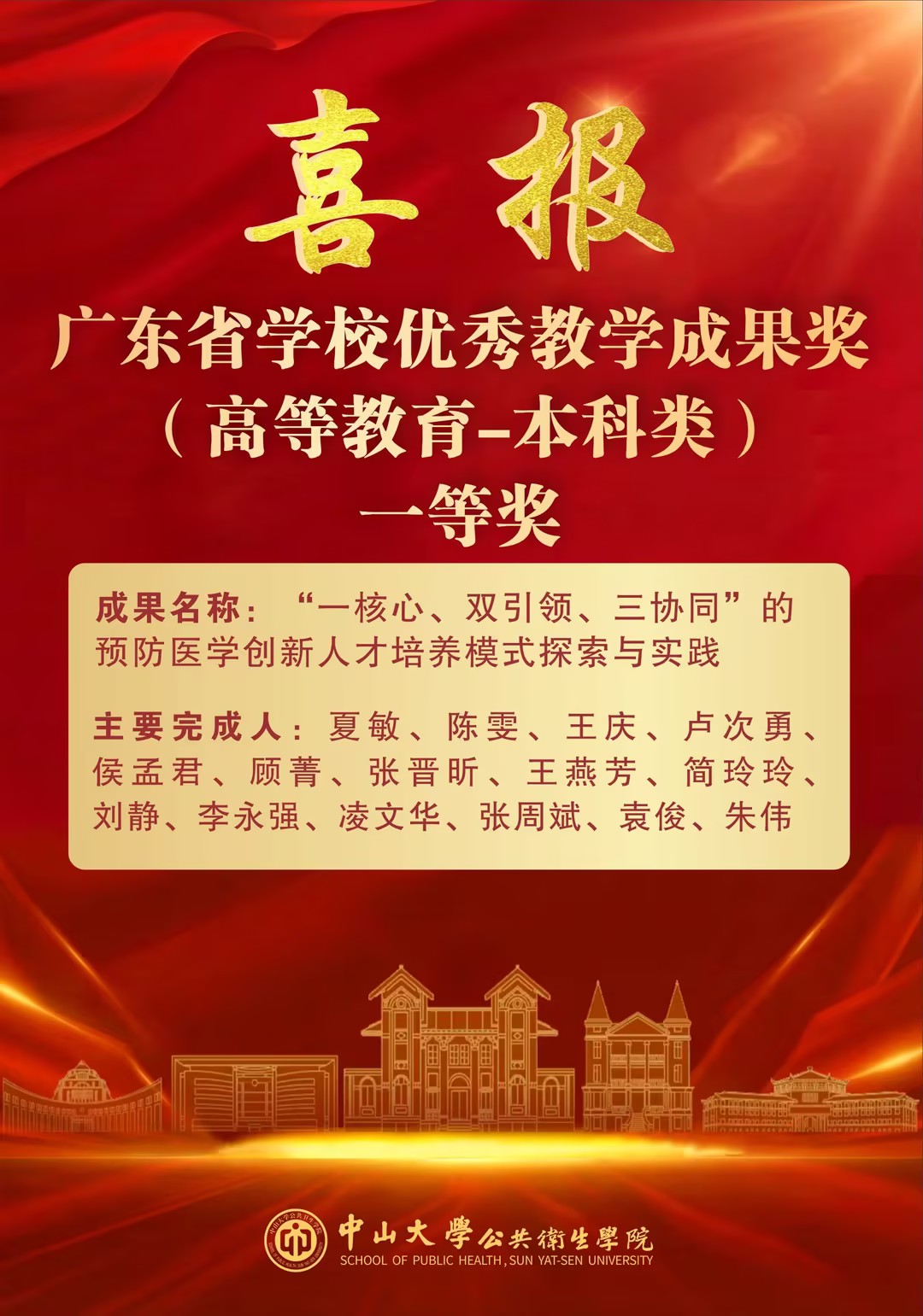 近日,广东省学校(高等教育)优秀教学成果奖评选结果揭晓,中山大学公共卫生学院与广州市疾病预防控制中心(广州市卫生监督所)联合申报的教学成果荣获本科类一等奖与研究生类二等奖。